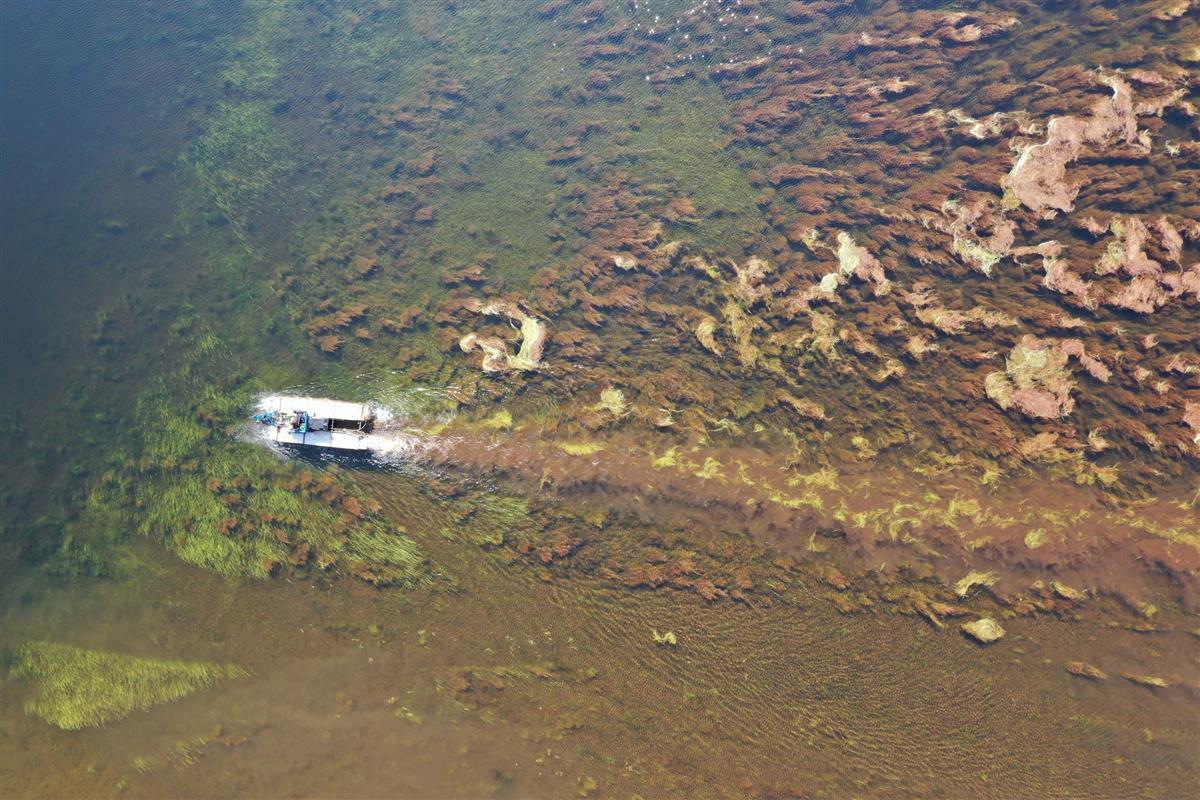 Massevekst: Dronebilde av vann sett ovenfra med krypsiv og vannfarkost. - Klikk for stort bildeKraftig vekst av krypsiv har blitt et stort problem i flere vassdrag på Sørlandet. Flumen Labs utforsker mulighetene krypsiv gir. Flumen Labs