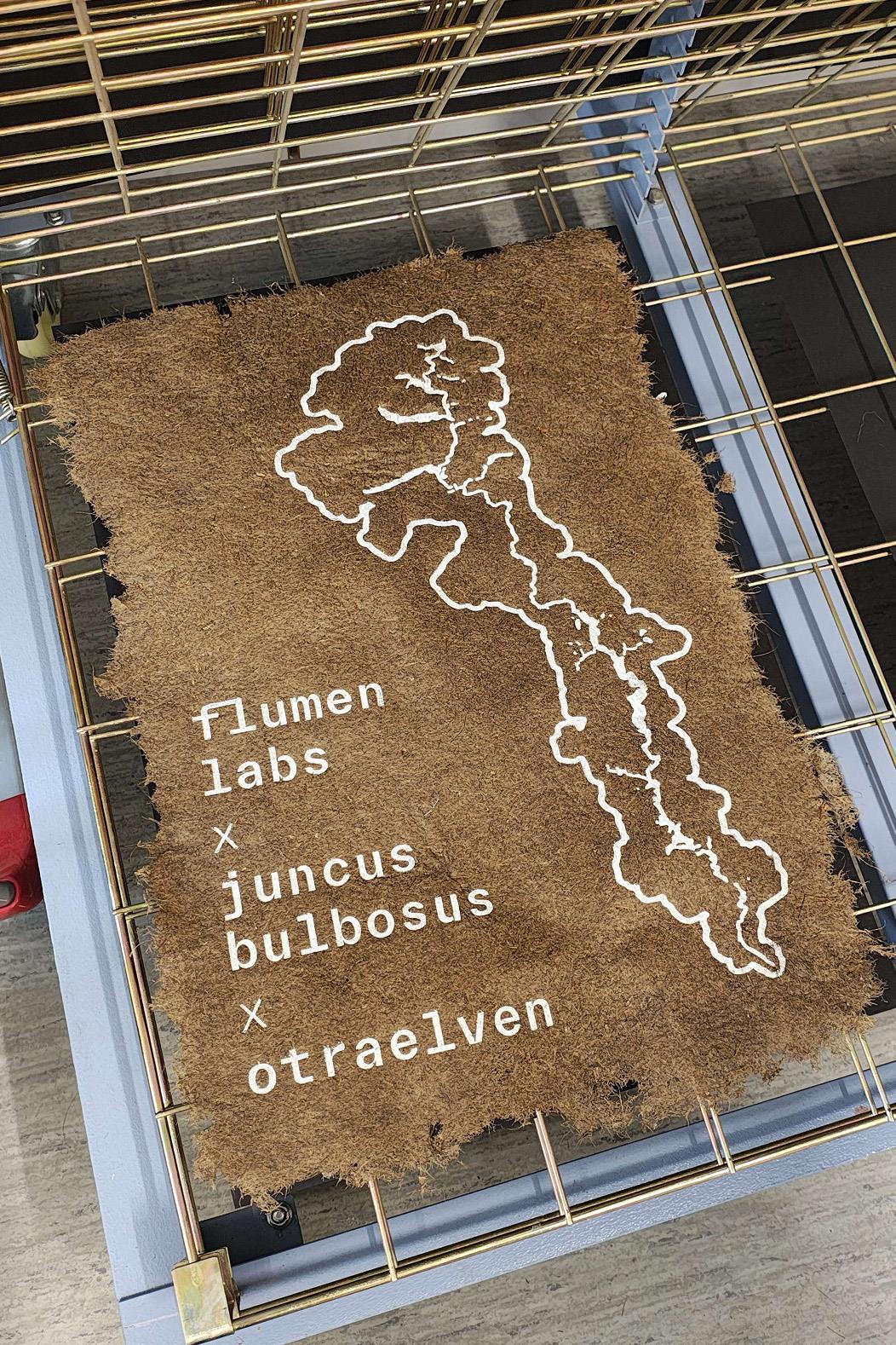 Biomaterial laget av krypsiv med utskrift, hvor det står Flumen Labs x juncus bulbosus x Otraelven. - Klikk for stort bildeKrypsivmaterial med utskrift. Flumen Labs