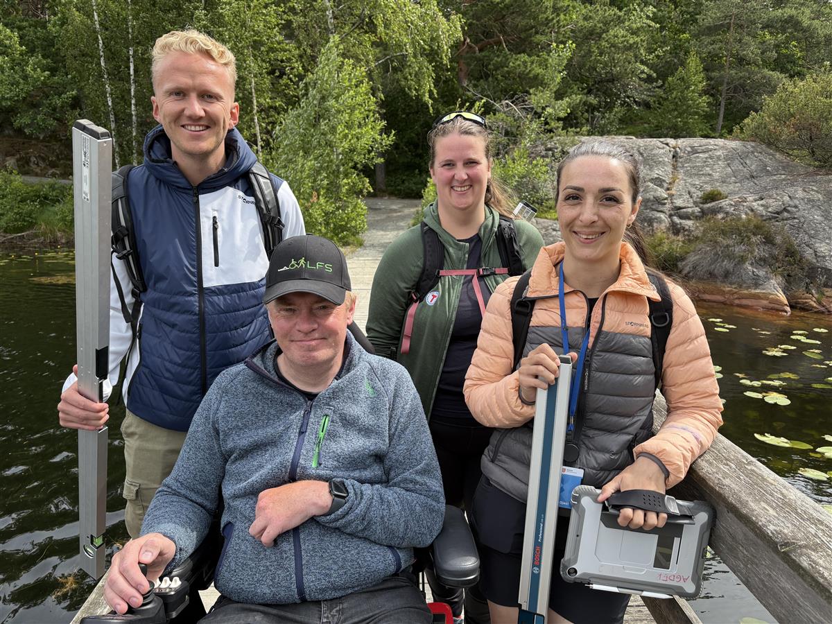 Kartleggere på befaring i Baneheia: Kartleggerne Simen Horpestad Stokka og Sara Elise Sandnes Augland får gode råd og tips fra ressursperson Freddy Ulvseth fra Handikapforbundet Agder og Kristina Humborstad fra DNT Sør.