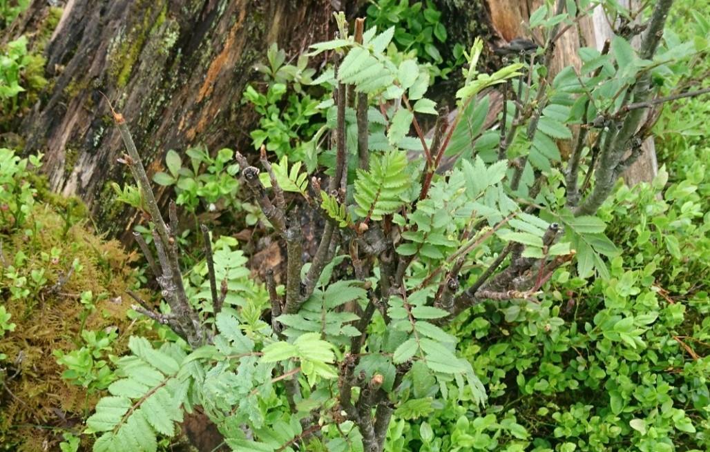 Rognplante som er beitet hardt over lengre tid. Her sees både ny og gammel kvistbeiting.