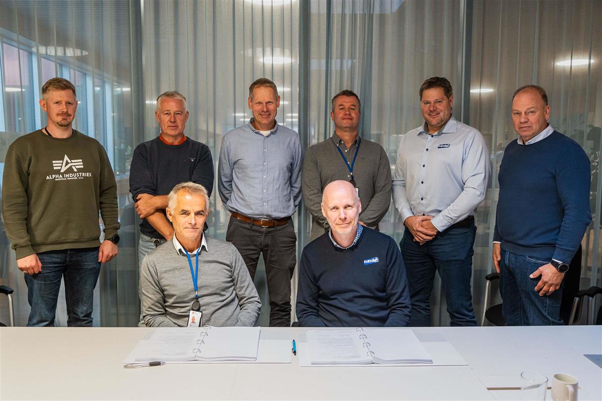 Foto av kontraktsignering med Agder fylkeskommune og Hæhre. Bak fra venstre: Einar Linga Larsen, Steinar Jakobsen, Geir Norum, Ragnar Hellerslien, Ole Jakob Gjetrang (Hæhre) og Magne Tveiten. Fremme fra venstre: Ola Olsbu og Dan Robert Granerud (Hæhre), stående foran kontraktspapirene. - Klikk for stort bildeKontraktsignering med Agder fylkeskommune og Hæhre. Bak fra venstre: Einar Linga Larsen, Steinar Jakobsen, Geir Norum, Ragnar Hellerslien, Ole Jakob Gjetrang (Hæhre) og Magne Tveiten. Fremme fra venstre: Ola Olsbu og Dan Robert Granerud (Hæhre). Agder fylkeskommune