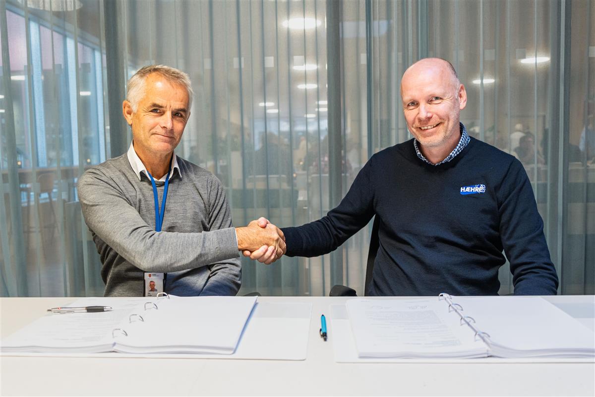 Foto av Ola Olsbu, fylkesdirektør for samferdsel i Agder fylkeskommune, og Dan Robert Granerud, daglig leder i Hæhre, som sitter ved et bord og tar hverandre i hendene.. - Klikk for stort bildeOla Olsbu, fylkesdirektør for samferdsel i Agder fylkeskommune, og Dan Robert Granerud, daglig leder i Hæhre. Agder fylkeskommune