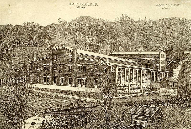 Høie fabrikker på Mosby i 1922. Til høyre i bilde ser vi Sagtjønn dam som bidro med vannkraft til fabrikken.