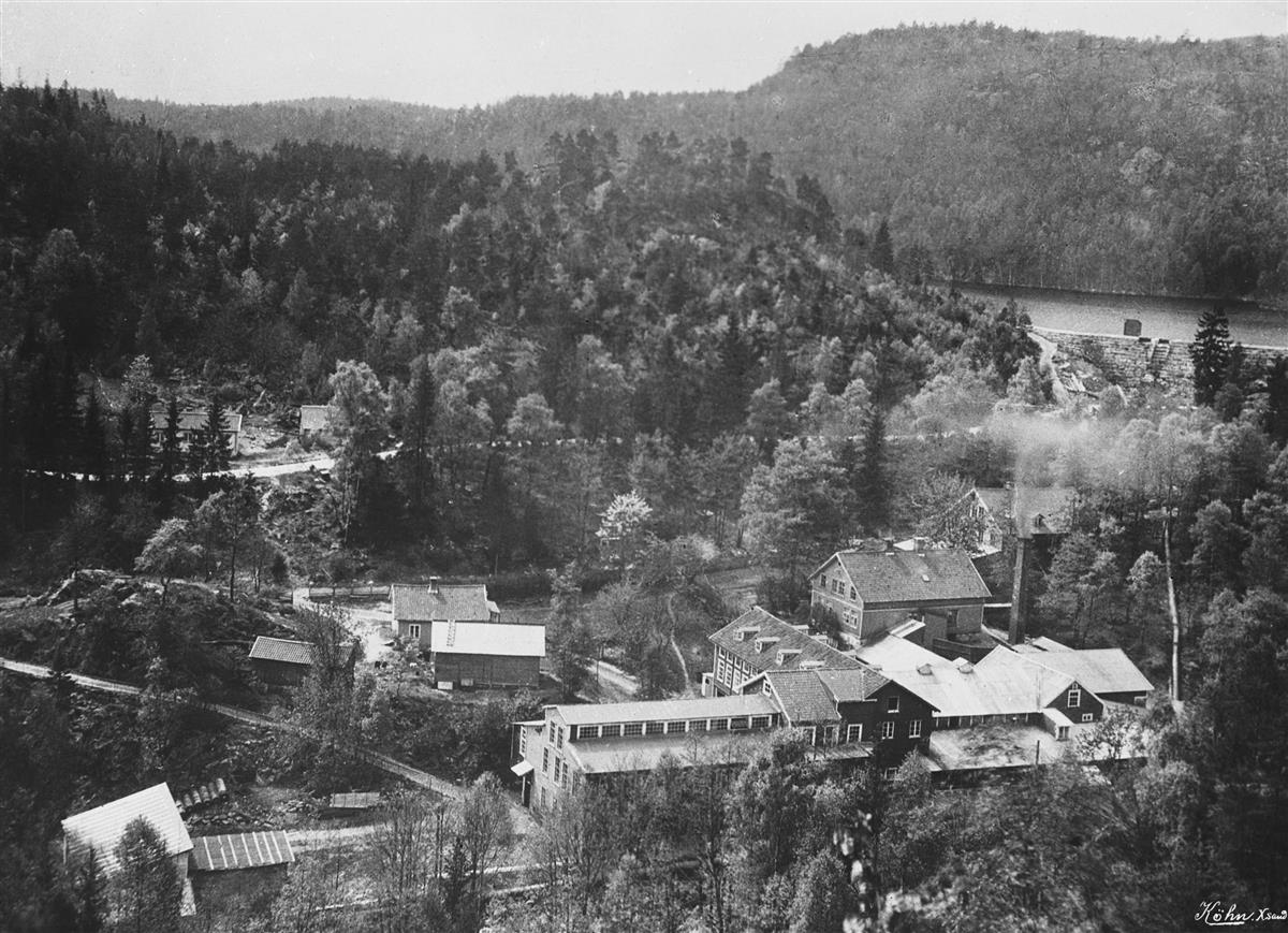 Høie Factories in Mosby in 1922. On the right in the photo is the Sagtjønn dam, which helped to supply the factory with hydropower.