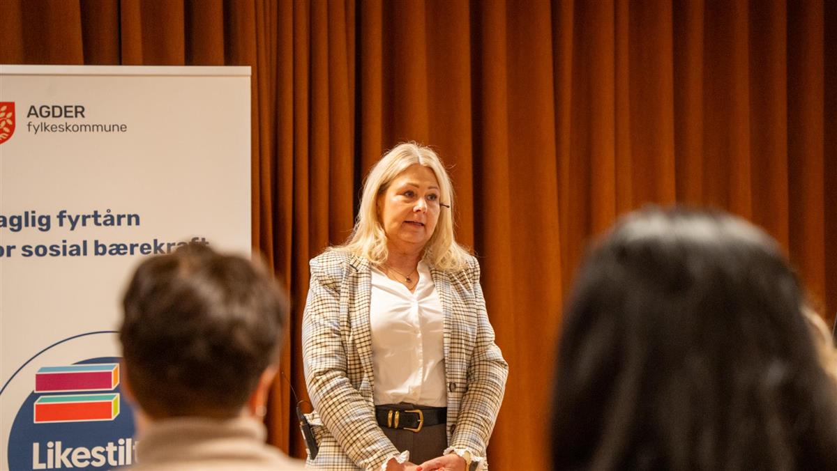 Patricia Hartmann, leder av Likestilt arbeidsliv i Agder fylkeskommune, fremhevet budskapet om viktigheten av å skape arbeidsplasser som støtter oss gjennom hele livet.