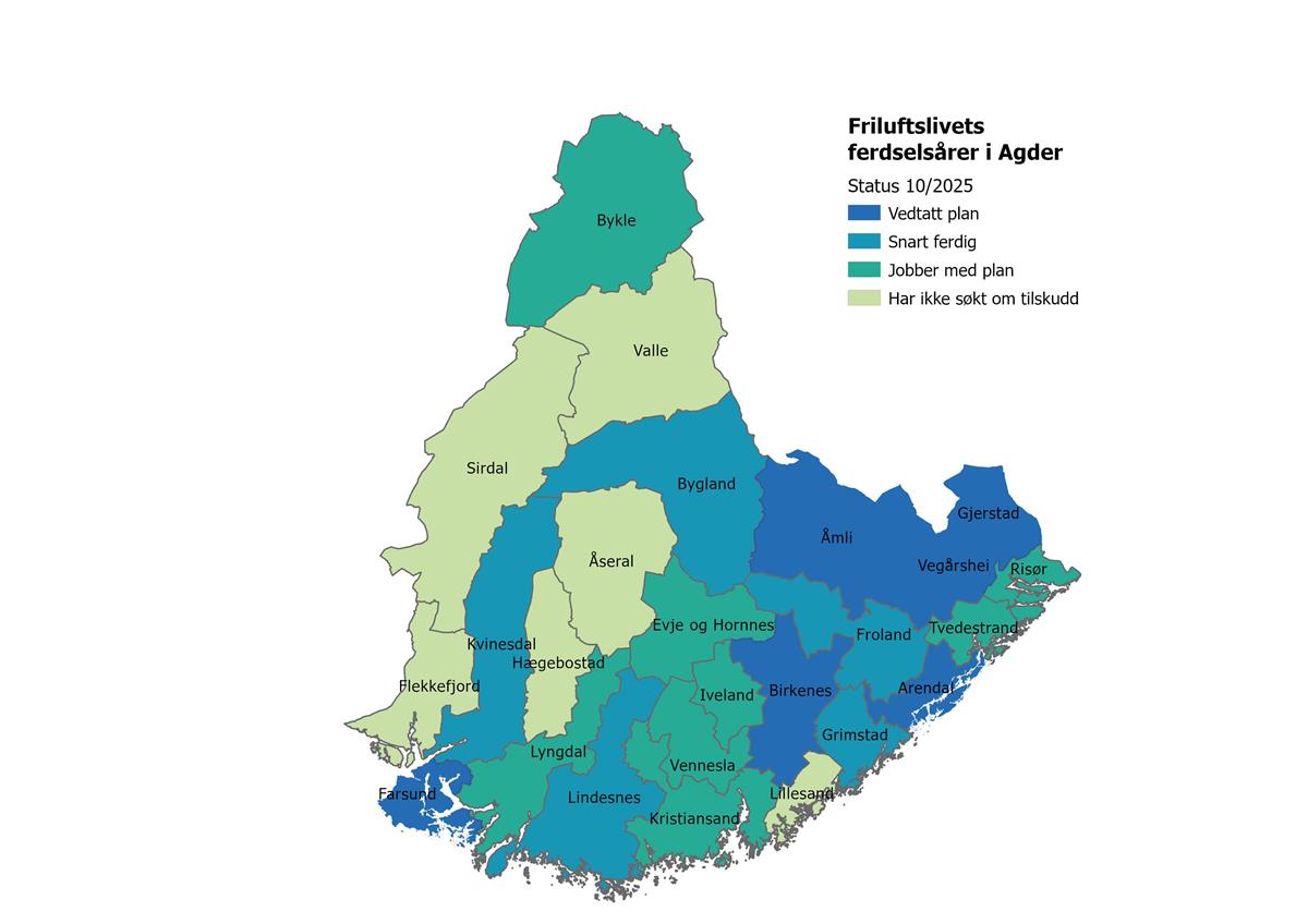 Kartet viser hvilke kommuner i Agder som per høsten 2025 enten har en vedtatt plan for friluftslivets ferdselsårer, hvilke som snart er ferdige, hvilke som jobber med planen og hvilke som ikke har søkt om tilskudd.  - Klikk for stort bildeStatus for kommunene i Agder fylkeskommune høst 2025