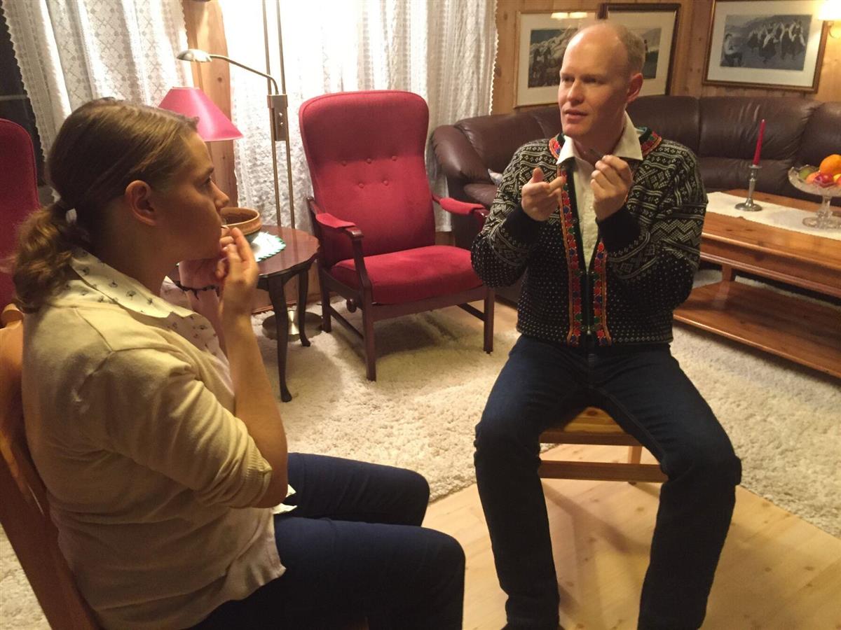 Sigurd Brokke lærer fra seg munnharpespill til Rebecca Egeland.