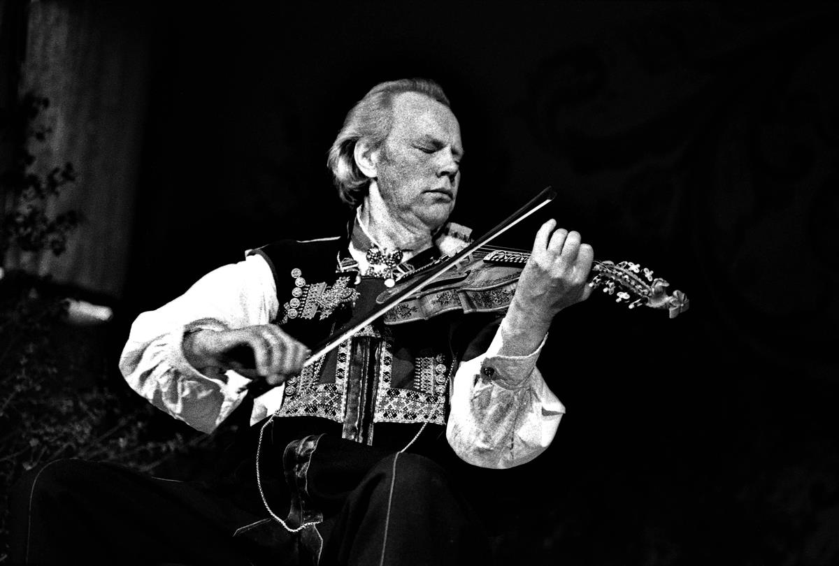 Torleiv Bjørgum (1921-1990) spiller hardingfele.