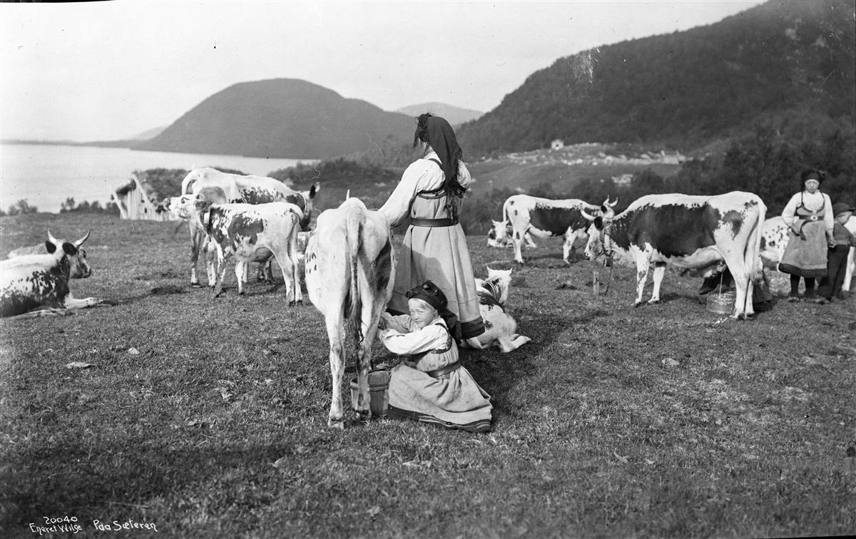 Melking av kyr, trolig Reisstøyl ved Bjørnevatn, Valle. 1918.